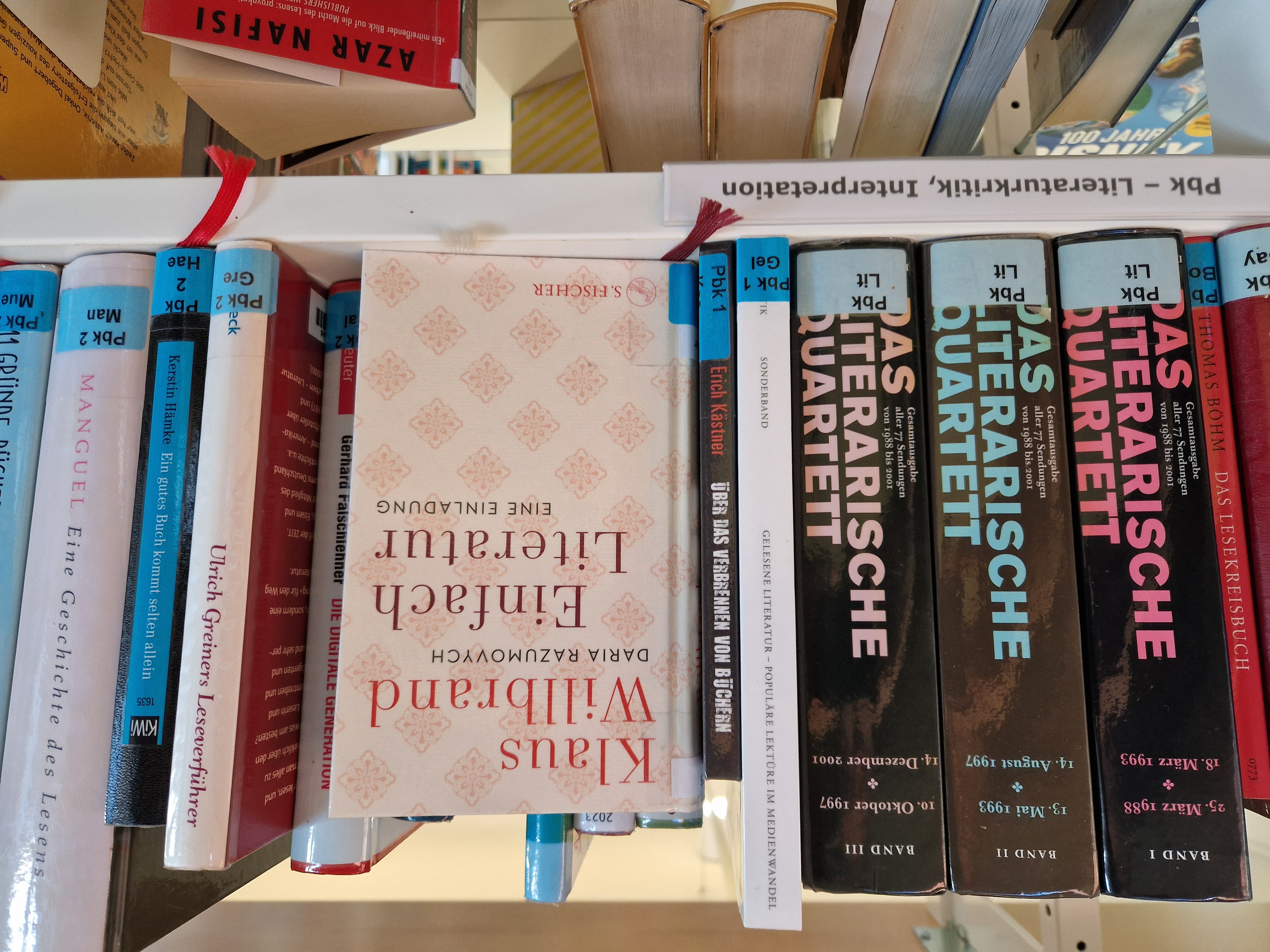 ... gibt es etwas versteckt bei den Sachbüchern ein halbes Bücherregal „Über Literatur“. Hier finden sie Bücher über Bücher. So zum Beispiel drei dicke Bände voller Mitschriften zu allen Sendungen des „Literarischen Quartetts“ mit Marcel Reich-Ranicki & Co. Auch wer etwas über Klassiker und moderne Klassiker wissen will, findet in diesem Regal Tipps und Antworten.