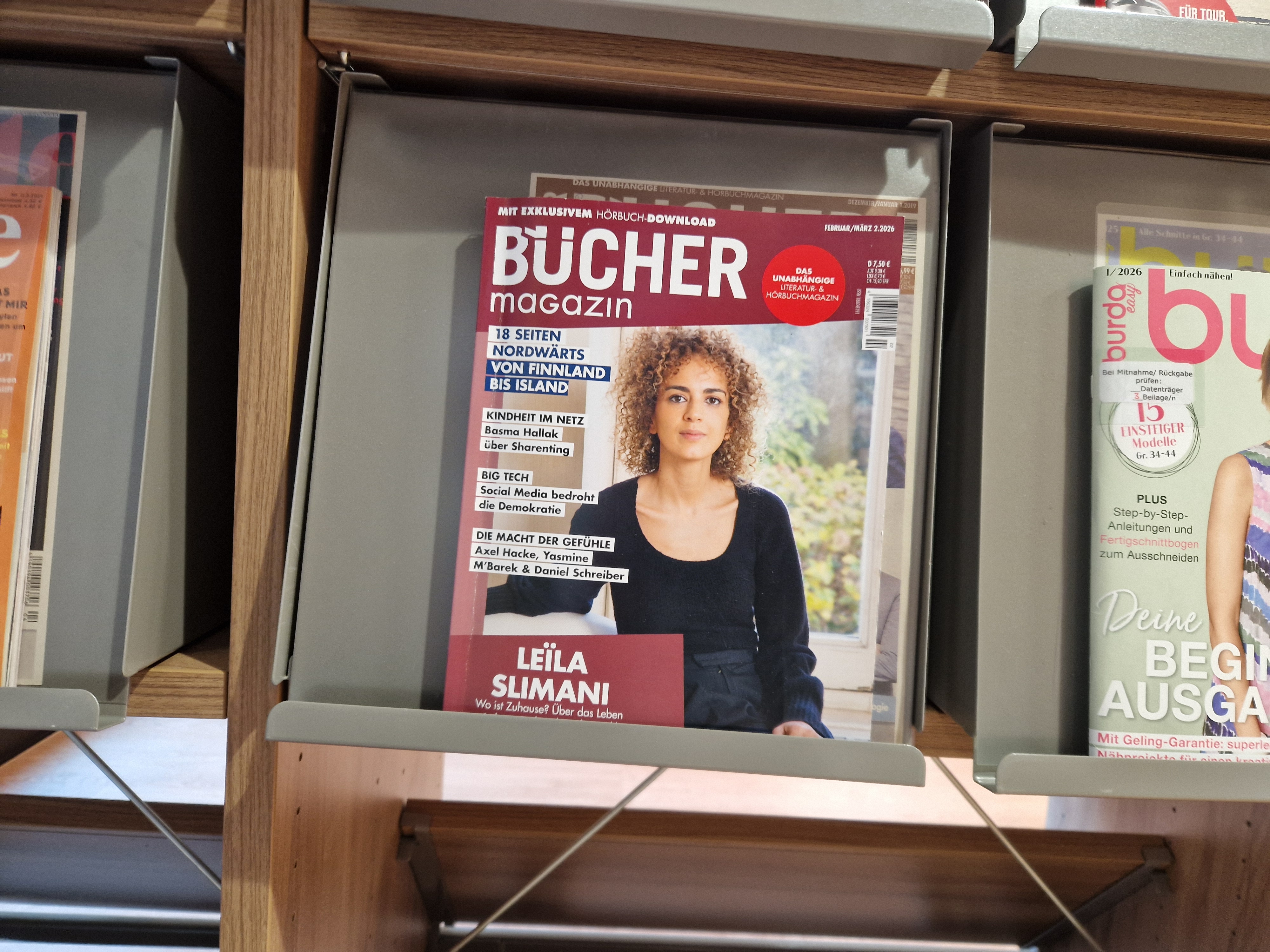 Hinter einer Klappe bei den Zeitschriftenregalen im Erdgeschoß gibt es im ersten Container die Zeitschrift „Bücher“, in der sich viele Rezensionen von Romanen, Krimis, Sachbüchern, Hörbüchern, Kinder- und Jugendbücher befinden. Dazu kommen Autorenportraits, Interviews, Sonderthemen oder auch Fotoreportagen über besondere Bücherorte.