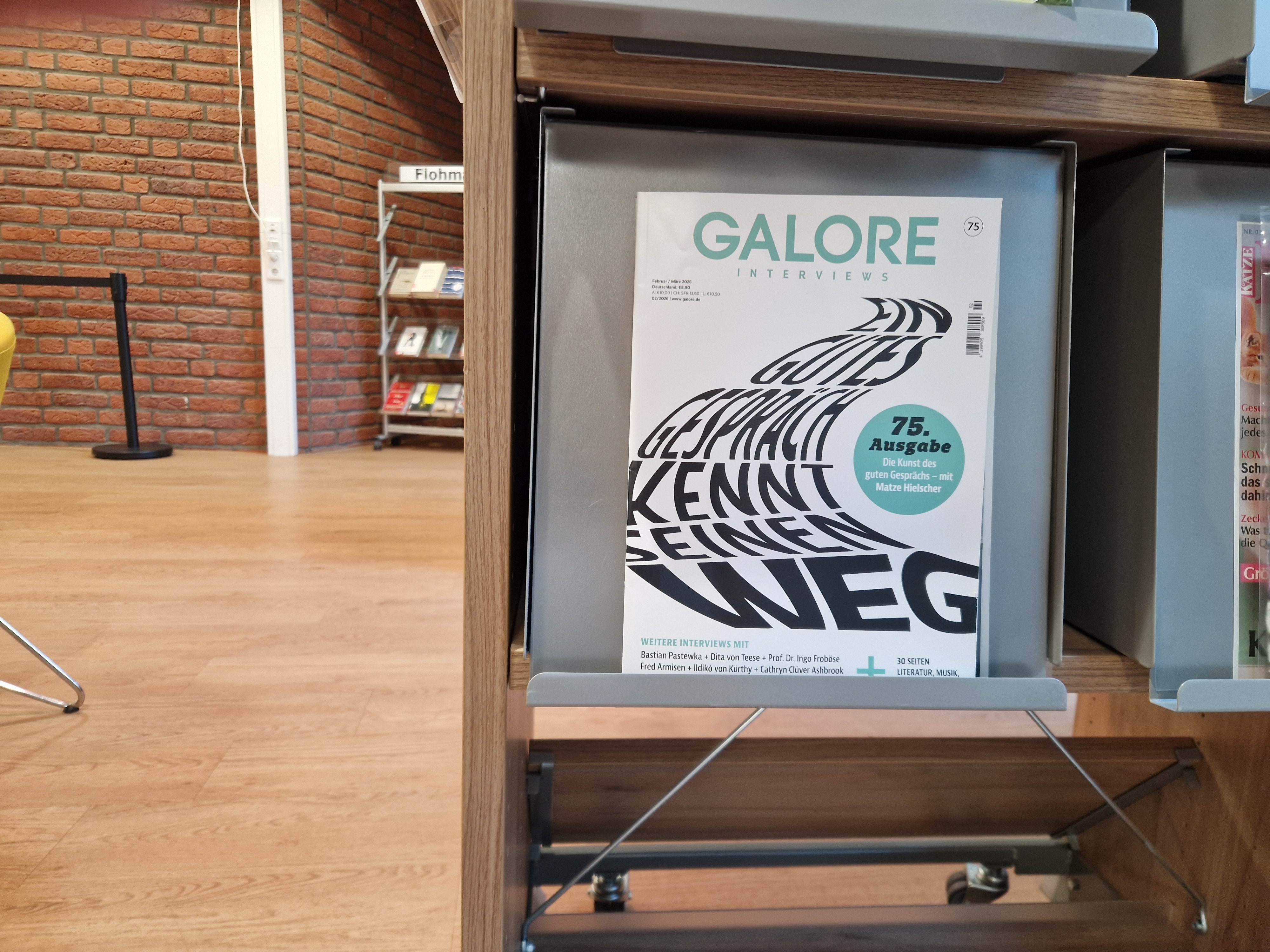 Die zweite Zeitschrift, die ich ihnen dort empfehle, heißt „Galore-Interviews“. Sie erscheint zweimonatlich und hat einen seitenstarken Kulturteil, in dem es vor allem um Autoren und Rezensionen neuer Romane und Sachbücher geht.