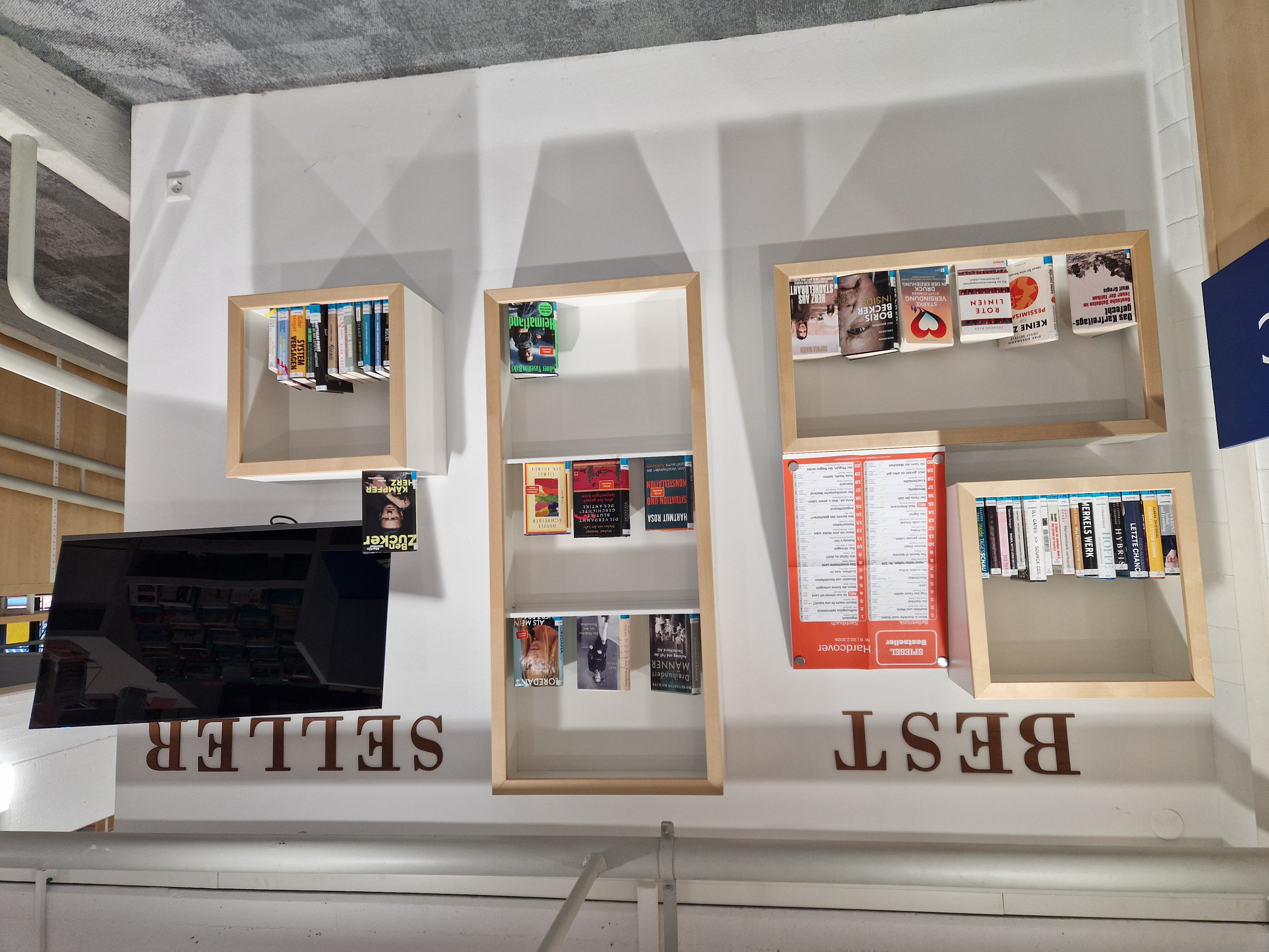 ... befinden sich Tische und Regale mit „neuen Sachbüchern“, „neuen Romanen“ und mit den Titeln der Spiegel-Bestsellerlisten. In Sichtweite links davon befindet sich ein Regal mit aktuellen #BookTok-Bestsellern.